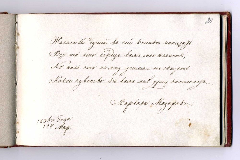 Любопытен альбом стихотворений и рисунков 30-х-40-х годов XIX века, принадлежавший неизвестной молодой девушке. Она путешествовала вместе с отцом по местам его служебных поездок.