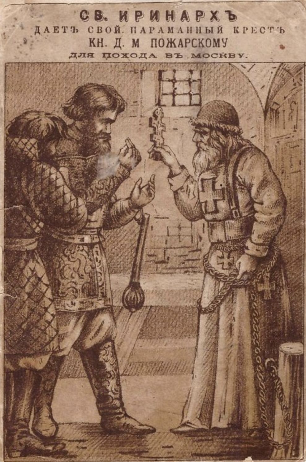 Точно так же старец Иринарх укрепляет благословением и Нижегородское ополчение и точно так же на одоление врагов вручает свой крест Минину и Пожарскому.