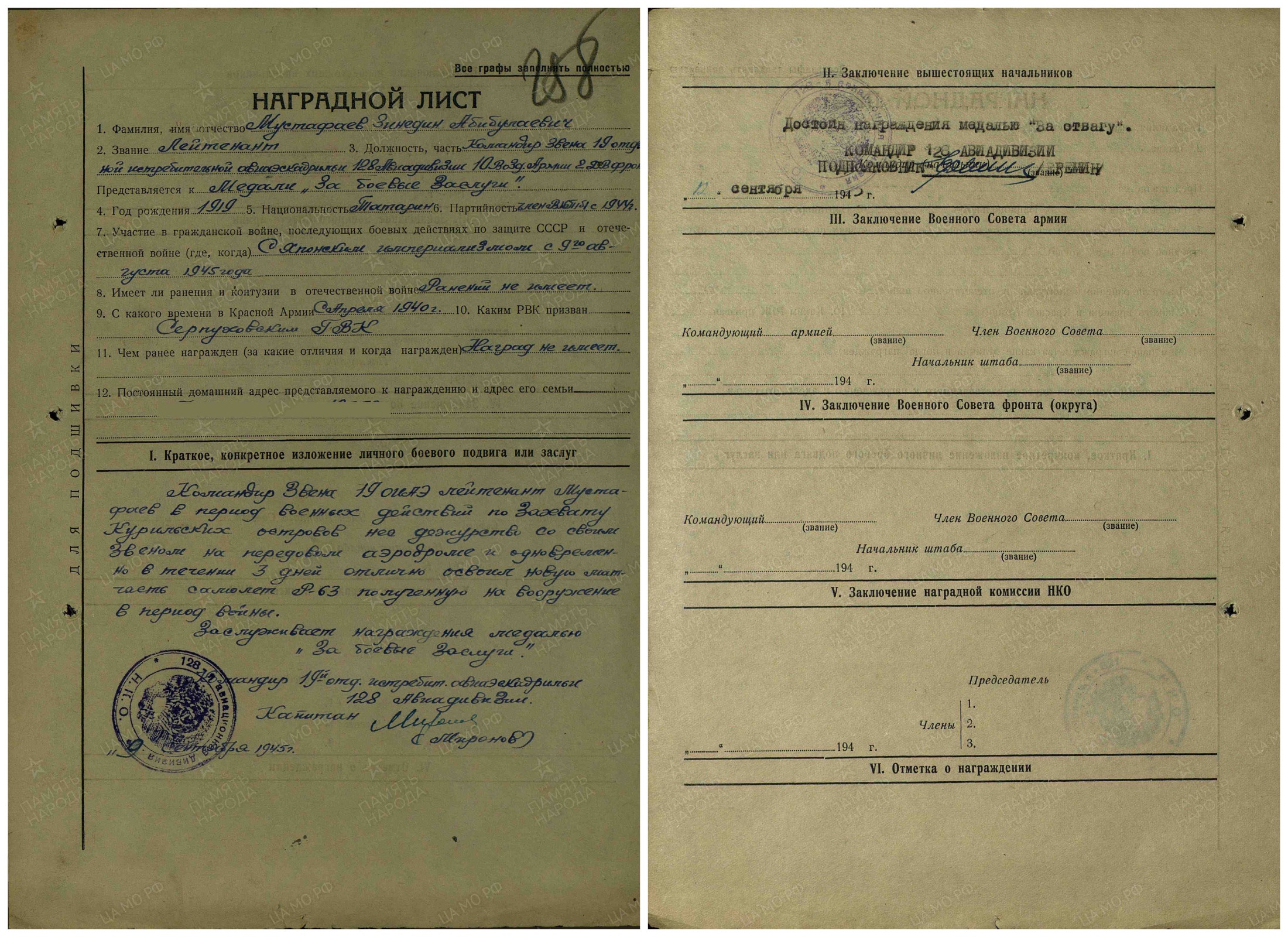 Документы архива Минобороны свидетельствуют, что во время Курильской наступательной операции Мустафаев прикрывал аэродром на Камчатке и одновременно с этим за три дня освоил новый самолет Р-63 "Кингкобра", за что был удостоен медали "За отвагу".