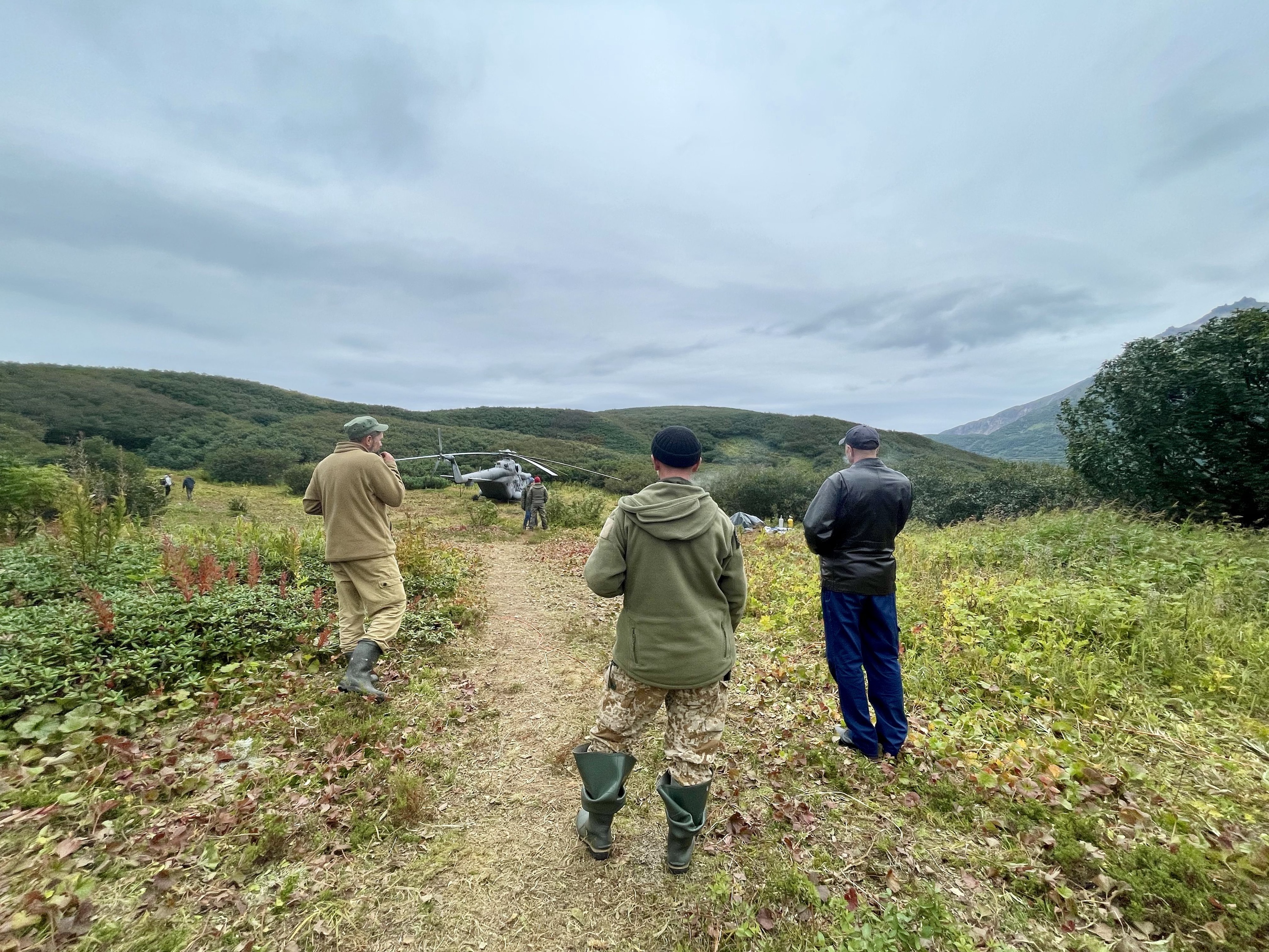 Экспедиционная группа стартует с военного аэродрома Елизово. До места назначения полтора часа перелета на вертолете Ми-8. Нам страшно повезло: накануне прибытия в Петропавловск-Камчатский наконец установилась летная погода, до этого низкая видимость неделями не позволяла забросить участников экспедиции в поле.