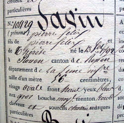 Тогда, исходя из того, что во французской армии аналогом русских егерей были солдаты лёгкой пехоты, Готье решил проверить списки 24-го полка лёгкой пехоты - и тут ему улыбнулась удача. "Настоящий" Савен числится в них под номером 10429. На самом деле его звали Пьером Феликсом, и родился он в Руане 13 июля 1792 года65. Документ содержит его словесный портрет: рост 156 сантиметров (что точно соответствует "русскому" росту 2 аршина 3 вершка, указанному в заявлении Савена от 4 октября 1839 года), лицо овальное, лоб высокий, нос большой (таким мы его и знаем по фотографиям), глаза голубые, рот средний, подбородок круглый, шатен, особых признаков нет. В графе профессии - прочерк.