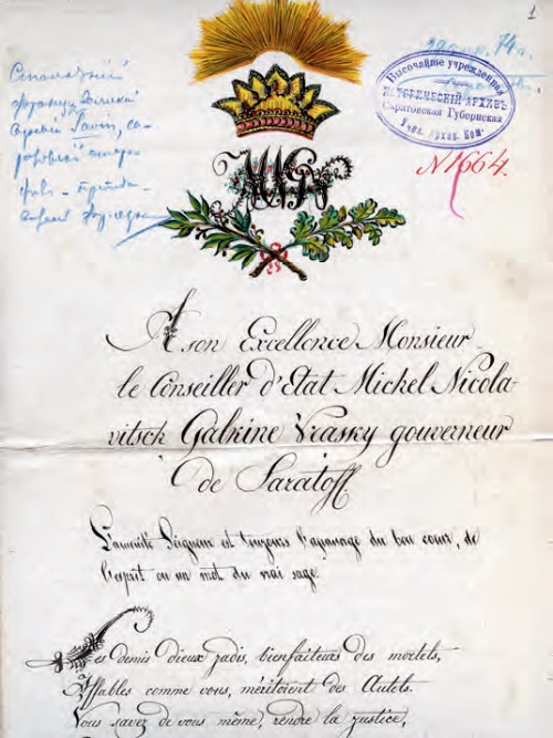 24 июня 1894 года последовал запрос из Парижа в адрес саратовских властей от ветеранов Крымской войны. Перед отправлением его сочли нужным отдать на перевод, который был выполнен на ломаном русском языке39. "Мы желали бы узнать, если, наверно, живёт в городе Саратове стадвадцатишестилетний бывший учитель французского языка, в Саратове тоже, и бывший офицер французских гусаров, под Наполеоном первым. У него, как говорят газеты, жила бы его дочь, теперь восьмидесятилетняя. Здесь предполагают, что дело идёт о старике, имеющем бумаги и документы своего отца, и сказающемся так пожилым, как теперь был бы свой отец, если бы он ещё жил до сих пор"40.