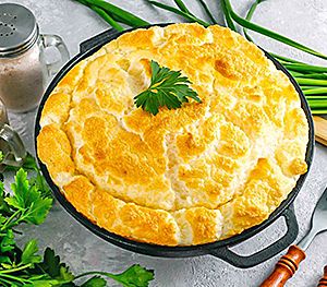 Рецепт: тщательно промыть картофель, очистить его от кожуры и натереть на крупной терке. Смешать тертый картофель с мукой, добавить яйцо, немного соли, щепотку соды и молотый черный перец. Лук очистить и мелко нарезать. Отдельно обжарить его на сковороде с салом до прозрачности. Вмешать обжаренный лук в картофельную массу. Смазать глубокую сковороду жиром, равномерно распределить по ней получившуюся смесь и поместить в предварительно разогретую духовку для запекания. После того как блюдо полностью приготовится, аккуратно переложить его на тарелку и подавать горячим, дополнив растопленным сливочным маслом или сметаной по вкусу.
