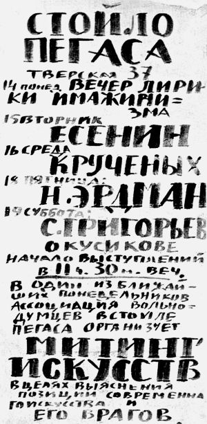 В годы НЭПа Есенин смог позволить себе с друзьями - поэтами-имажинистами - недолгое время содержать литературное кафе "Стойло Пегаса" на Тверской улице, 37. Заведение работало до двух часов ночи, вход был платным, а подавали там настоящие пирожные, что было редкостью. Чай, правда, был морковным (из натертой сушеной моркови), но меню отличалось приятным разнообразием: венский шницель, бефстроганов, кулебяки, лангет...