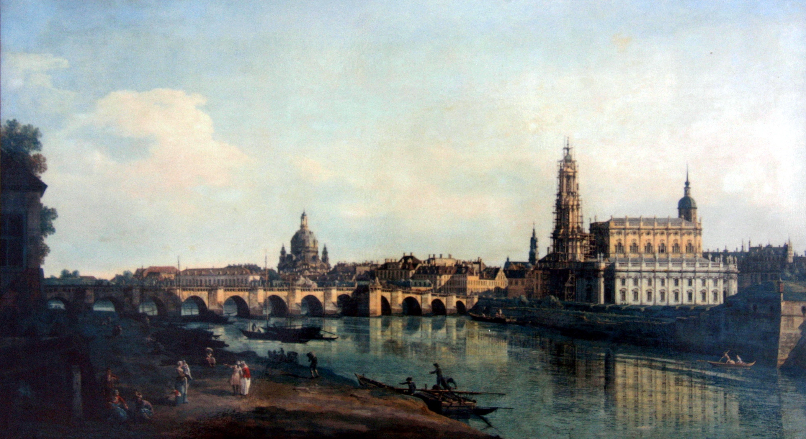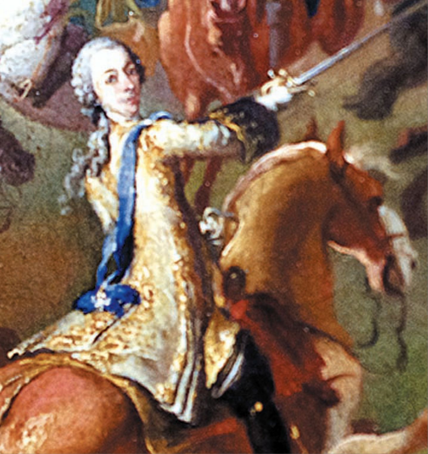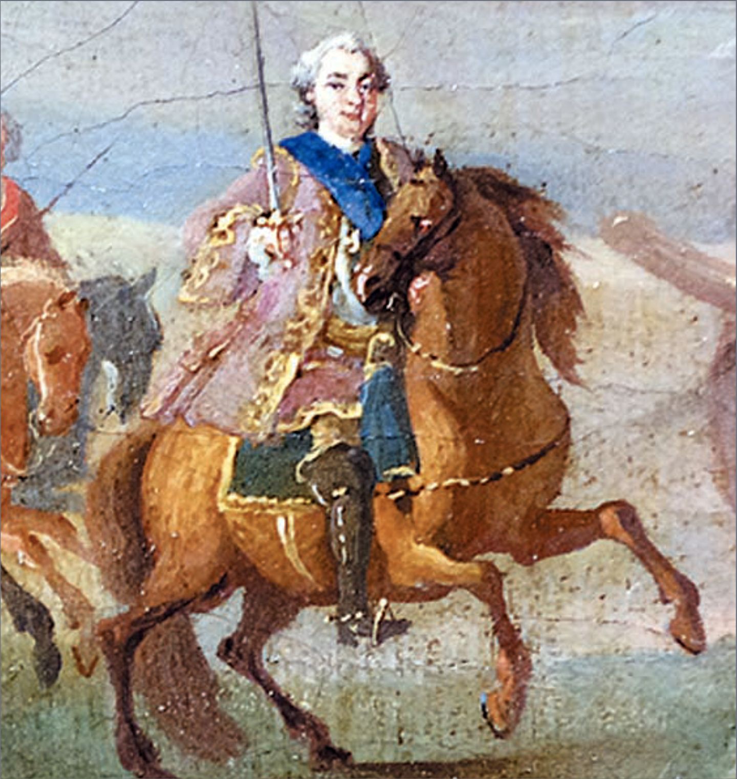Вновь обратимся к "Конному портрету". Перед нами групповой портрет всадников на фоне битвы. В левом верхнем углу картины мы зрим батальную сцену, пылающий город и очень большой мост через реку. Указующий перст императрицы заставляет нас внимательно посмотреть на эту часть "Конного портрета". Художник напомнил о событиях недавнего прошлого и изобразил захваченный пруссаками Дрезден и знаменитый мост через Эльбу, впоследствии описанный Николаем Михайловичем Карамзиным в "Письмах русского путешественника": "С час стоял я на мосту, соединяющем так называемый Новый город с Дрезденом, и не мог насытиться рассматриванием приятной картины, которую образуют обе части города и прекрасные берега Эльбы. - Сей мост, длиною в 670 шагов, считается лучшим в Германии; на обеих сторонах сделаны ходы для пеших и места для отдохновения"17.