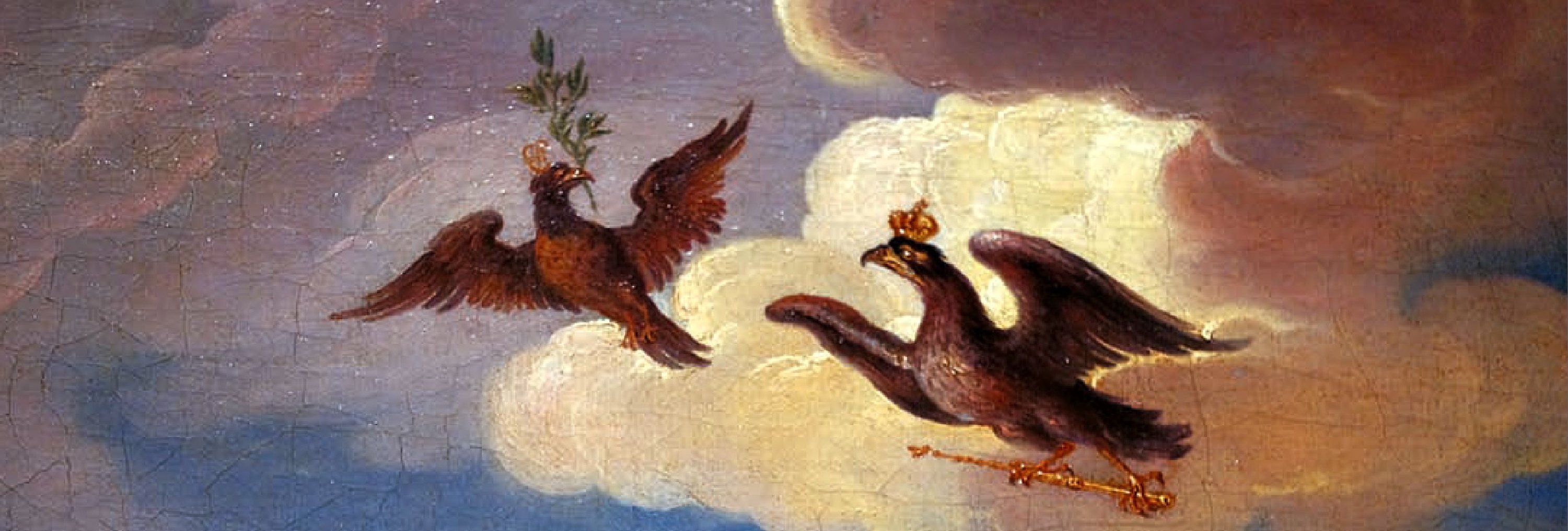 Ещё раз всмотримся в батальную часть "Конного портрета". Кажется, что уже ничто не сможет спасти погибающий Дрезден. Но к городу уже летят два орла, парящие над головой императрицы. Один - в императорской короне и со скипетром, другой - с золотым императорским вензелем из двух латинских букв EP (Елизавета дщерь Петра) и оливковой ветвью в клюве. Орёл - это одна из самых древних эмблем, означающая власть, господство, верховенство и государственную прозорливость. Оливковая ветвь, реже именуемая также масличной ветвью, - это одна из эмблем миролюбия, начиная с Античности до наших дней18. В уже не единожды упоминаемой оде 1742-го Ломоносов писал о миролюбии царицы: