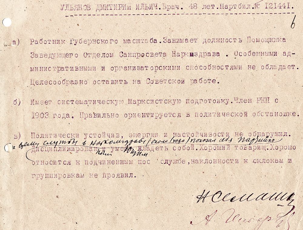 Проблем хватало: о них он не раз доверительно писал сестре Марии Ильиничне (док. 3, 5-6, 10). Местные здравотделы неохотно подчинялись распоряжениям Центра (док. 7), имеющиеся курортно-санаторные ресурсы не справлялись с числом прибывающих больных, Совет труда и обороны пытался изъять его рабочий автомобиль (док. 8-9), а близ Алупки в ходе служебной поездки машина Дмитрия Ильича подверглась нападению "зеленых"10. Наконец, сказывалось пристрастие Ульянова-младшего к спиртному, которое стало предметом обсуждения на заседании президиума Крымского обкома и в конечном счете привело к отзыву его в Москву11.