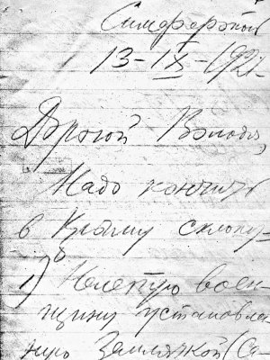 Я решил наладить теперь постоянную связь через курьеров, но сегодня не удалось послать своего - все места заняты, придется просить кого-ниб[удь] из надежных товарищей. И ты также имей в виду, что в четверг (раз в неделю) в 6 вечера к нам отправляется скорый поезд, приходящий сюда в субботу днем. Так что приготовь газеты к 7-му и письмо и пошли с кем-ниб[удь] или специально командируй кого-ниб[удь] до Симферополя со срочным возвратом - пусть опишет поезд, укажет недостатки и привезет последнюю Крымскую информацию.