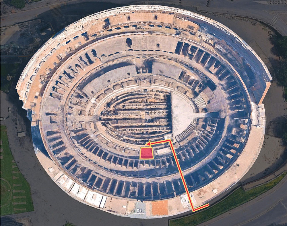 Туннель идет от императорской ложи, главного места на южном ряду Колизея, похожего на королевскую ложу. Император проходил под трибунами и даже под землей, а затем выходил на южной стороне Колизея.