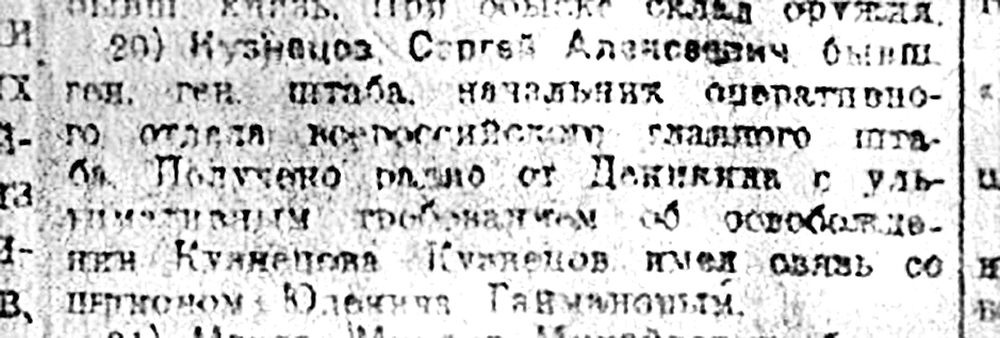 В радиограмме шла речь о бывшем генерале Сергее Алексеевиче Кузнецове, руководившем подпольной антибольшевистской военной организацией "Национального центра" в Москве. Он был арестован летом 1919 г., а сведения об этом просочились к белым, видимо, через подпольщиков, остававшихся на свободе.