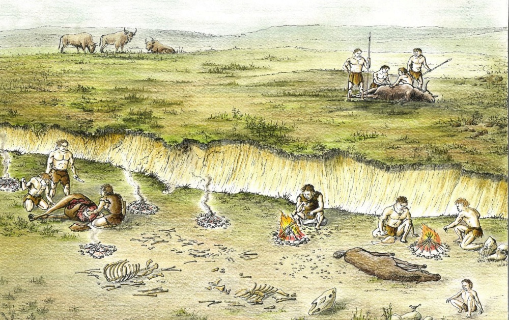"Фауна крупных млекопитающих была представлена древними слонами, бизонами, различными видами оленей и лошадей, хорошо приспособленных к открытым ландшафтам. Каменные орудия изготавливались преимущественно из кремня аллювиального генезиса.