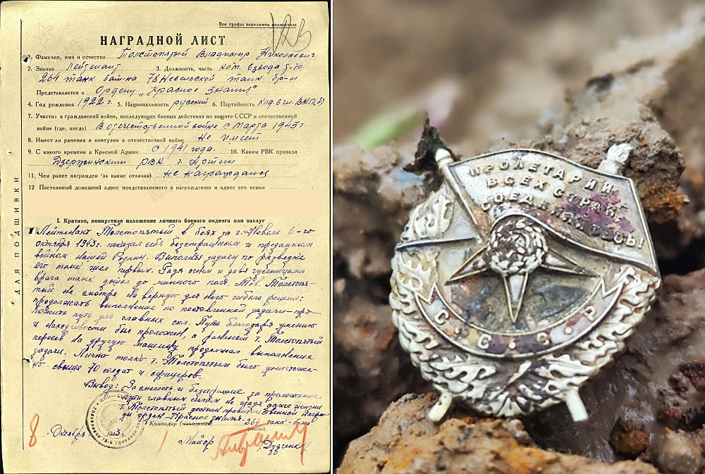 По его номеру установили имя героя. Это командир взвода 264-го танкового батальона 78-й Невельской танковой бригады лейтенант Владимир Николаевич Толстопятый. Награду ему вручили 11 октября 1943 года.