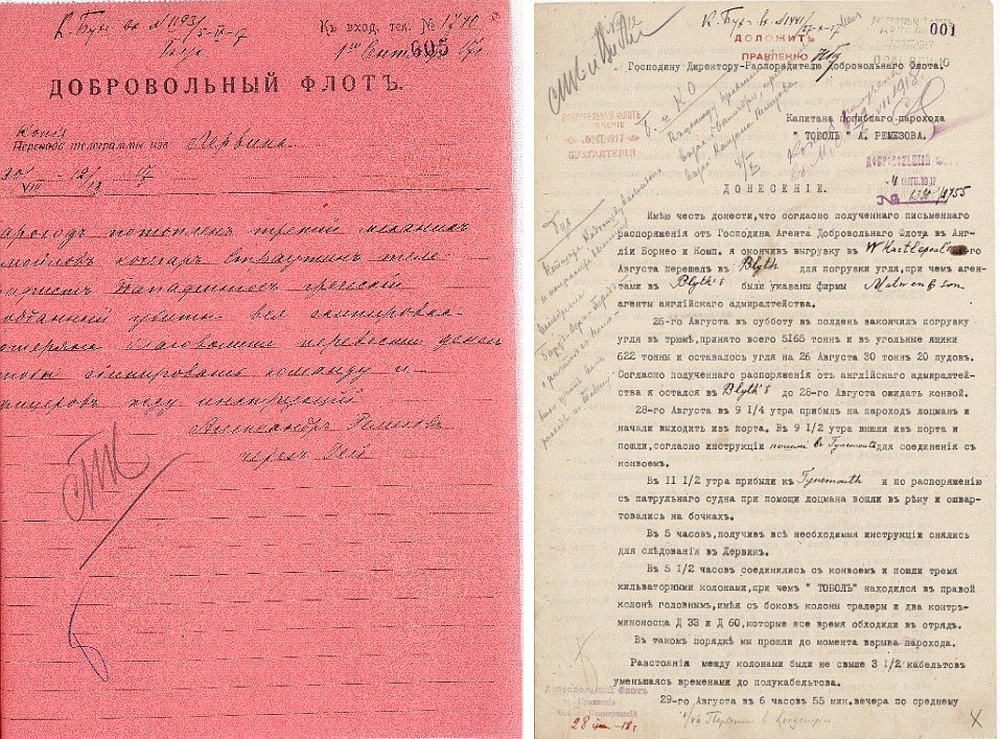 Архив предоставил копии списков экипажа и подробное донесение капитана парохода А. Ремезова, в котором он указал на взрыв: "Пароход был взорван миной, выпущенной с подводной лодки... Мина попала в машинное отделение и в результате взрыва погибли вахтенный механик В. И. Самойлов, машинист 2-го класса Страутин и кочегар греческого происхождения Папафингос. В 7 часов 10 мин. вечера по ср. Грин. времени пароход пошел кормой на дно, причем при погружении сломалась фор-мачта. Всех нас подобрали, сопровождающие нас тралеры". Капитан также упомянул о хладнокровии и мужестве экипажа в момент спасения.