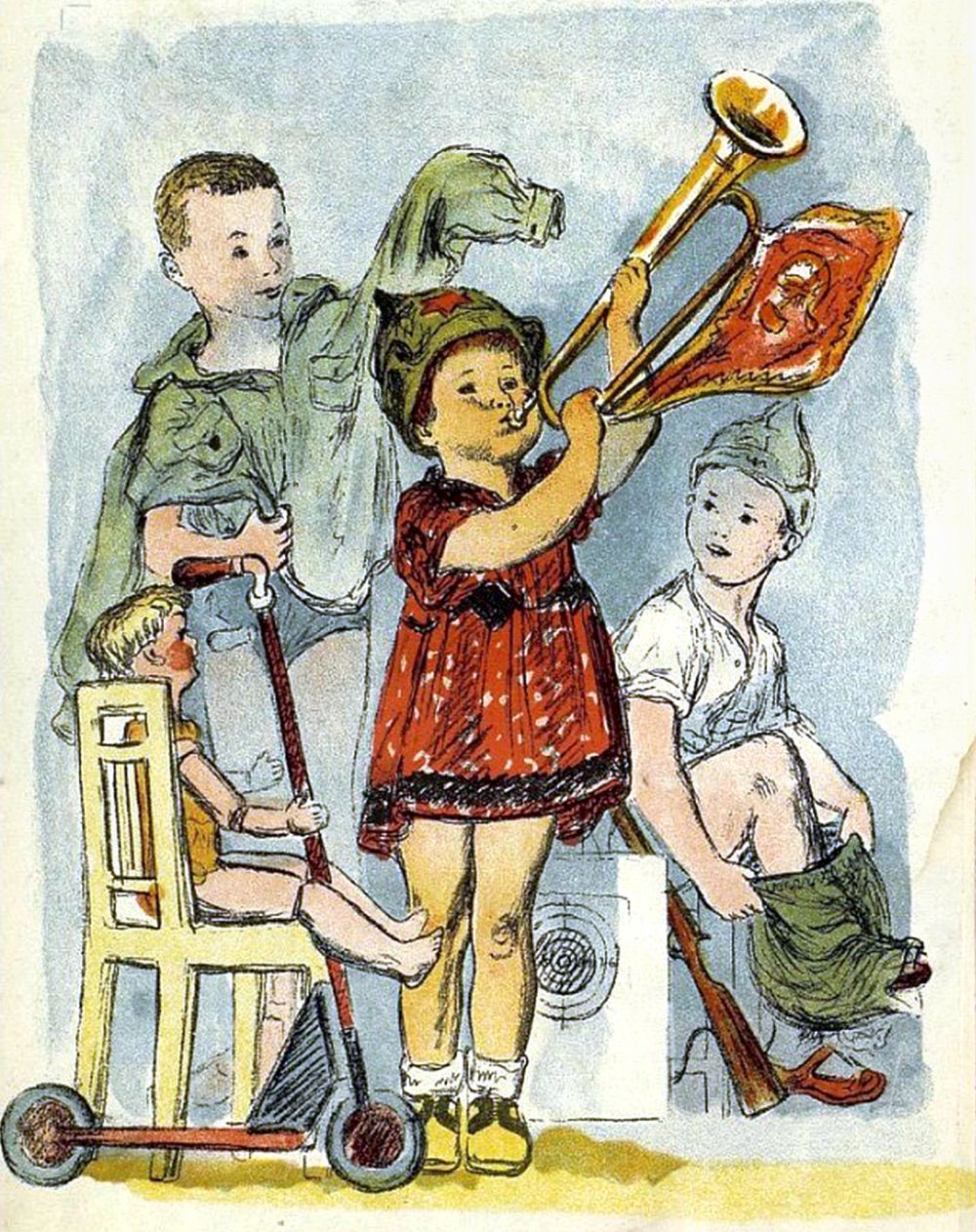 "Девочка едет по тротуару на самодельном самокате. Правая нога на планке, худые руки напряженно вцепились в деревянный руль. Левой ногой девочка отталкивается и едет. Едет всего одну короткую секунду и снова работает ногой, но улыбка не сходит с ее лица. Девочка знает, что сейчас ее очередь блаженствовать, и она будет блаженствовать, пока не уступит руль кому-то из трех пацанов, дожидающихся ее. Счастливая пора, когда весь смысл жизни заключается в том, чтобы оторвать вторую ногу от земли и ехать, ехать на подшипниковых колесах"19.