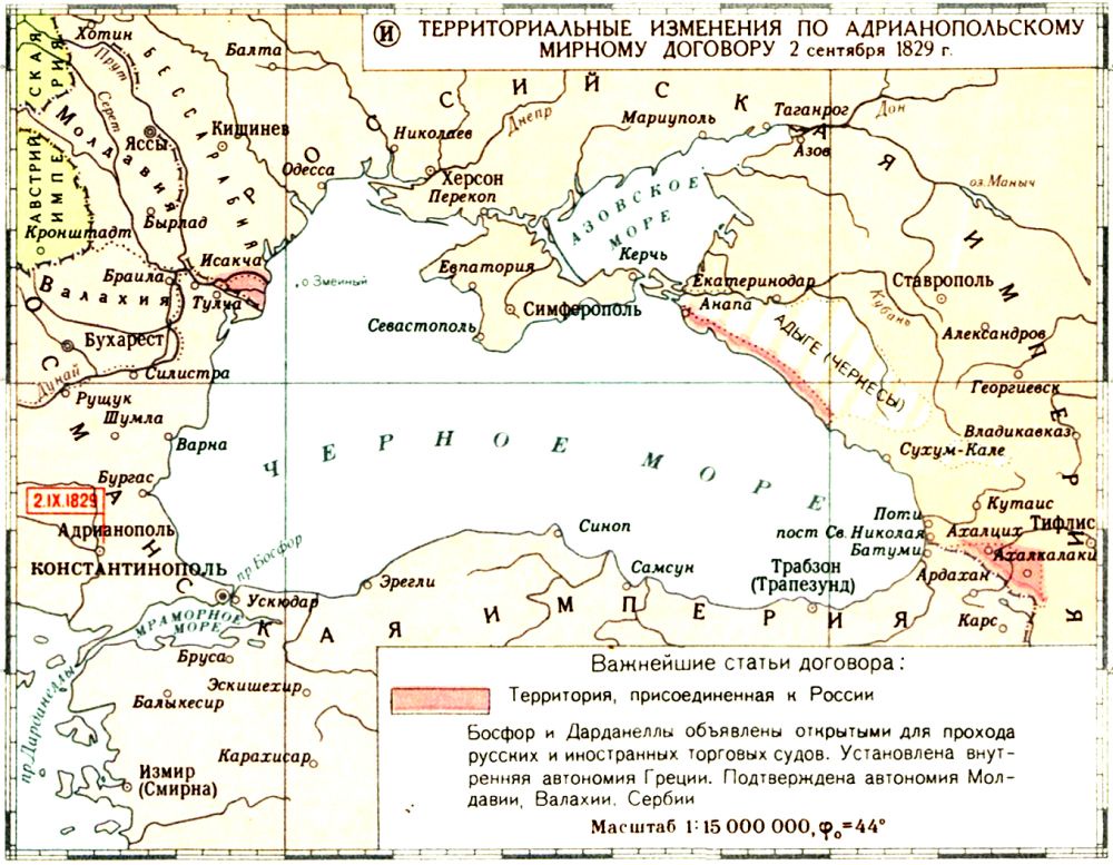 Турция уступила, а Россия приобрела устье Дуная с островами, а также все восточное побережье Черного моря от устья Кубани до пристани Святого Николая (пограничный пост на берегу моря, примерно посередине между Поти и Батуми). Отныне в состав Российской империи вошла "Черкесия" - обширная область, занимавшая весьма выгодное геополитическое и военно-стратегическое положение, замкнутое в форме треугольника между Анапой, Екатеринодаром и Гаграми.