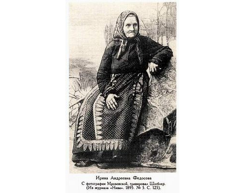 Ирина Андреевна Федосова - русская народная сказительница, вопленица, исполнительница народных песен. Родилась 29 апреля 1827 года в Олонецкой губернии в многодетной семье Андрея Ефимовича и Елены Петровны Юлиных. Начала работать в шесть лет, в 12 лет стала подголосничать на свадьбах.
