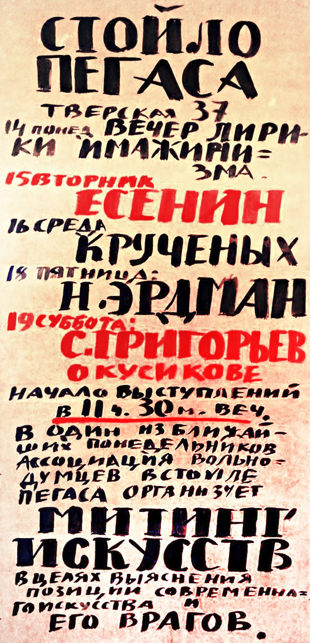 Удивительно: в годы военного коммунизма "вольнодумцы" развили бурную частную коммерческую деятельность - создали издательство, две книжных лавки, журнал. И еще кафе "Стойло Пегаса" на Тверской улице. Оформил его художник-имажинист Георгий Якулов. На ультрамариновых стенах он нарисовал желтой краской портреты "вольнодумцев" с их стихами.