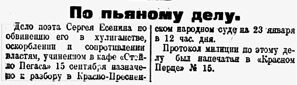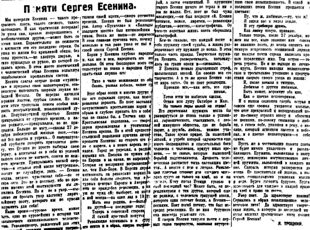 "Мы потеряли Есенина - такого прекрасного поэта, такого свежего, такого настоящего... Он ушел из жизни без крикливой обиды, без ноты протеста, - не хлопнув дверью, а тихо прикрыв ее рукою, из которой сочилась кровь. В этом месте поэтический и человеческий образ Есенина вспыхнул незабываемым прощальным светом... Нет, поэт не был чужд революции, - он был несроден ей. Есенин интимен, нежен, лиричен, - революция публична, эпична, катастрофична. Оттого-то короткая жизнь поэта оборвалась катастрофой... Умер поэт. Да здравствует поэзия! ...Да здравствует творческая жизнь, в которую до последней минуты вплетал драгоценные нити поэзии Сергей Есенин".