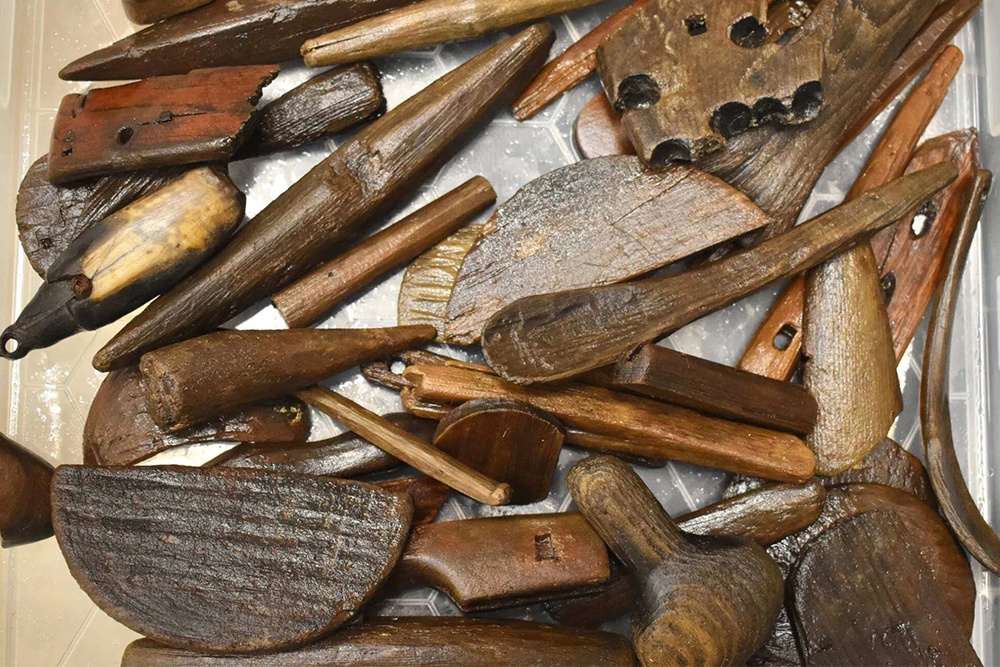 Фрагмент маски, который сотни лет пролежал в вечной мерзлоте, оказался в грязи во время отлива в общине Куигнак на западе Аляски. Деревянные ложки, игрушки, рыболовные приманки и другие артефакты XVII века разлетелись по пляжу.