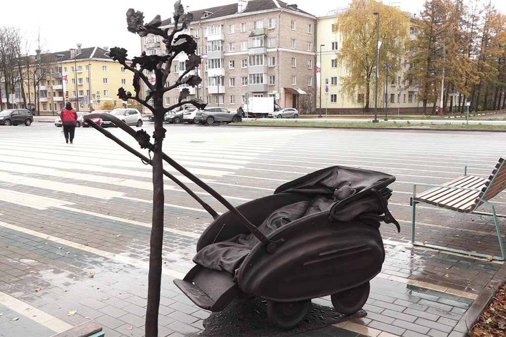 В подмосковном городе Дубна установили необычный памятник. Перед ДК "Октябрь" появилась бронзовая детская коляска.