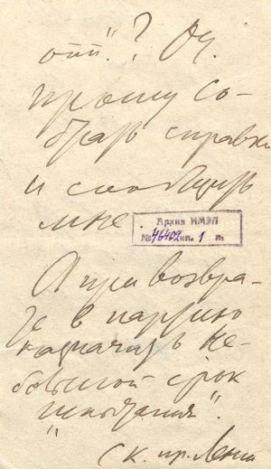 - 7. РГАСПИ. Ф. 2. Оп. 1. Д. 21670. Л. 1-1об. Также см. публикацию записки в: Ленинский сборник. М., 1970. Т. XXXVII. С. 329.
