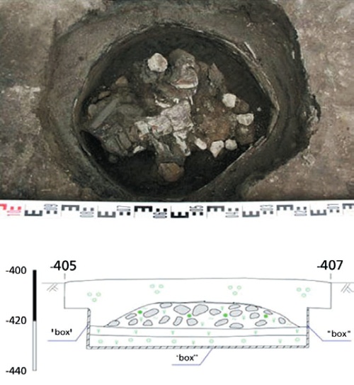 Таким образом, найденная яма являлась довольно сложным объектом, возникшим в результате единовременных действий и перекрытым под уровень древней дневной поверхности ещё до возникновения городской застройки. Сооружение объекта можно представить в такой последовательности. В поверхности материка была выбрана круглая яма с вертикальными стенками, плоским дном и уступом в средней части высоты. На дно и по краям приготовленной ямы до уровня уступа были уложены специально подогнанные по размерам части "короба". Затем низ ямы был забутован глиной, а поверх неё засыпан песком. На этот песок уложен череп лисицы.