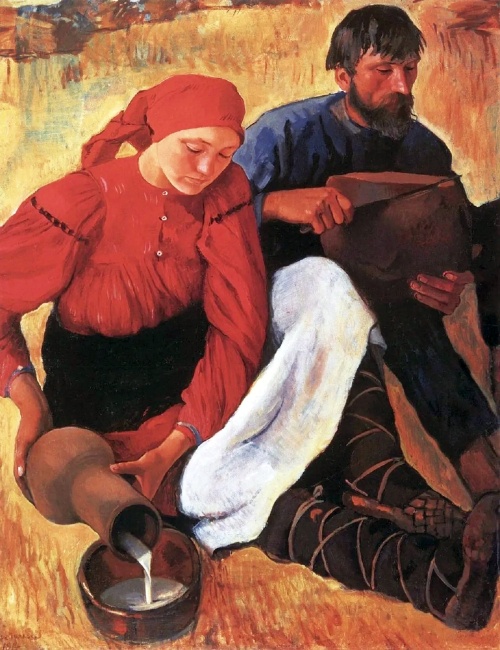 "Нельзя сказать, что работа З. Е. Серебряковой "Крестьяне" (1914. РМ) полностью отражалa ход дел в крестьянских деревнях. Невозможно забывать, что художница рисовала обобщённые образы, а не конкретных людей. Многие семьи были слишком бедны для таких красивых, опрятных, ярких, новых одежд, как на картине. Не у всех хватало средств и на такие аппетитные краюхи хлеба и большие кринки молока. В большей части крестьянские семьи жили намного беднее, чем их изображает художница. В исследуемой картине это, бесспорно, зажиточная идеализированная семейная пара".