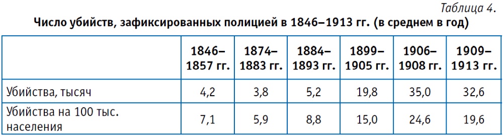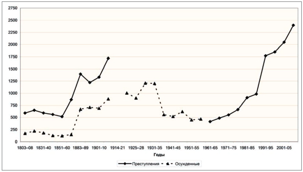 Были два исключения - царствование Николая I и сталинская эпоха: в обоих случаях преступность возвратилась к уровню конца XVIII столетия - времени расцвета крепостничества. Повышение преступности происходило скачками: в годы либеральных реформ она повышалась, а в консервативные стабилизировалась или росла медленно. Самое значительное увеличение преступности произошло после Великих реформ - в 2,7 раза с 1851-1860 по 1883-1889 годы, после 1917-го и Гражданской войны - в 1,4 раза с 1911-1913 по 1931-1935 и после реформ конца 1980-х-начала 1990-х - в 2,6 раза с 1981-1985 по 2006-2010 годы.
