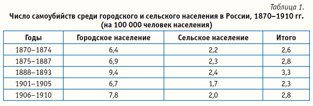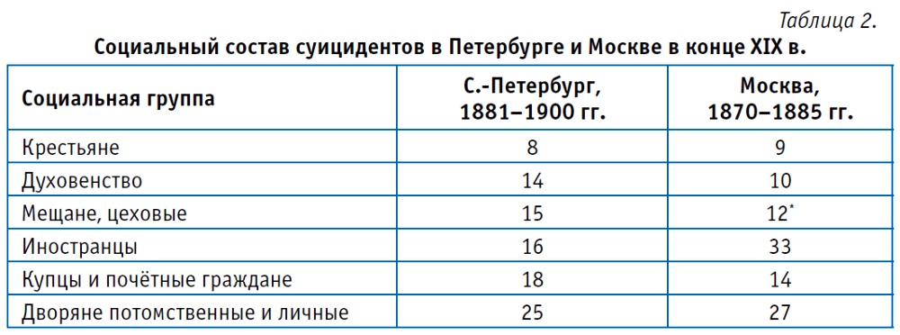 Неудовлетворённость своим положением испытывали главным образом горожане, а не крестьяне, в особенности жители столиц и крупных городов, где суицидальность была существенно выше, чем в среднем по России: в Петербурге - примерно в 4-6 раз, в Москве - в 3-4 раза, а в Одессе (1902-1908) - даже в 5-10 раз. При этом и среди городских жителей крестьяне, составлявшие 45 процентов населения (1897), совершали наименьшее число самоубийств: в 3-4 раза реже, чем дворяне, в 1,5-2 раза реже, чем купцы и почётные граждане6 (см. табл. 2).