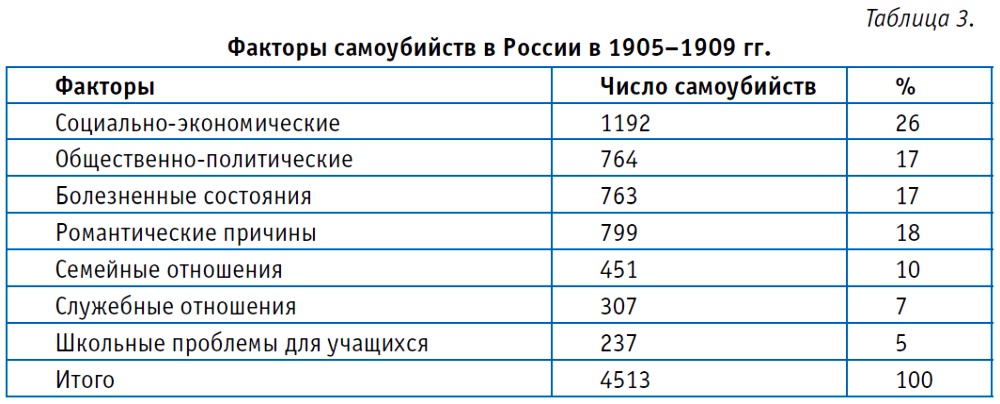 Показательно, что, говоря о роли материального фактора, исследователи суицидального поведения имели в виду именно относительную депривацию - что хорошо для крестьянина, то плохо для дворянина - и подчёркивали значение степени неравенства9. Понижение числа самоубийств во время войн, несущих, как правило, трудности и лишения, также свидетельствует о том, что материальный фактор не был решающим в суицидальном поведении. Об этом же говорит и уменьшение самоубийств под влиянием революционных событий10.