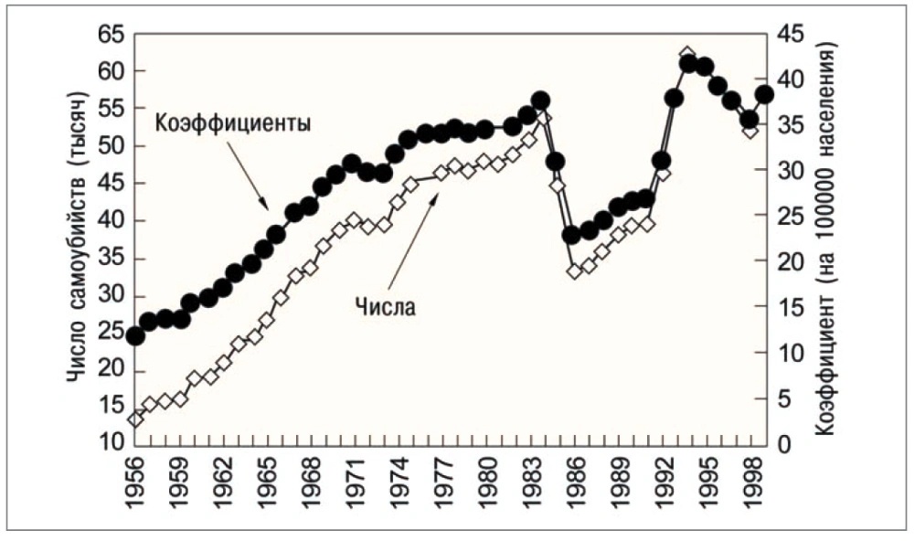 Как и в дореволюционное время, в деревне уровень самоубийств снижался, а в городе увеличивался: монотонный тренд роста городских суицидов нарушали два резких повышения, в 1937-м и 1947-м, и заметный спад во время Второй мировой войны. В течение следующих 28 лет (1956-1984), несмотря на повышение жизненного уровня населения, коэффициент самоубийств вырос более чем в 15 раз - до 38,8; в первые два года перестройки резко упал - в 1,7 раза, а с 1986-го снова стал быстро расти13 (см. рис. 2).