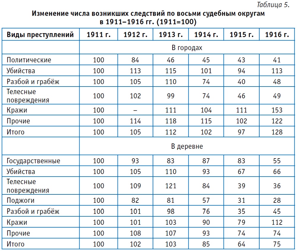 В 1914-1916 годах по восьми судебных округам, по которым сохранились сведения о числе следствий, уровень преступности был ниже, чем в 1911-1913, в 1,3 раза, в том числе в городе он увеличился на 3 процента, а в деревне уменьшился на 36 процентов. Вряд ли это можно объяснить только уходом миллионов здоровых мужчин в армию.