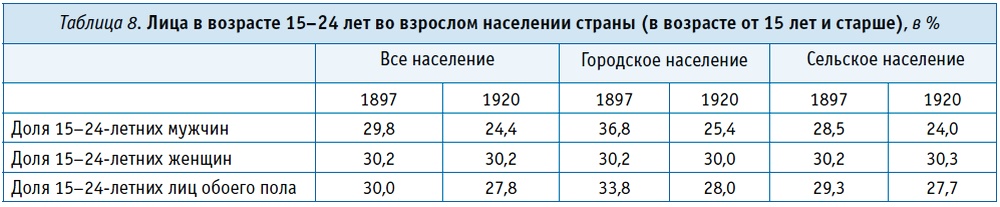 Теперь рассмотрим российский вариант. Среднегодовой естественный прирост населения с 1861-1865 по 1911-1913 годы увеличился с 1,42 процента до 1,68 процента. Сравнение возрастной структуры населения России в 1897 и 1920 годах показывает, что эта прибавка недостаточна, чтобы существенно повлиять на долю лиц в возрасте 15-24 лет11 (табл. 8).