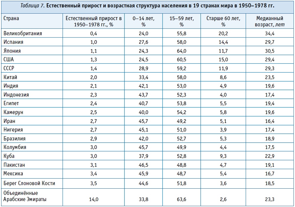 Теоретически в стране с более высокими темпами роста населения действительно должно быть больше молодых и меньше пожилых людей. Однако увеличение доли молодых происходит в большей степени не за счёт революционного возраста 15-24 лет, а за счёт лиц в возрасте 0-14 лет9. Многое зависит от конкретной ситуации, и не всегда более высокому естественному приросту соответствует более молодое население10 (табл. 7).