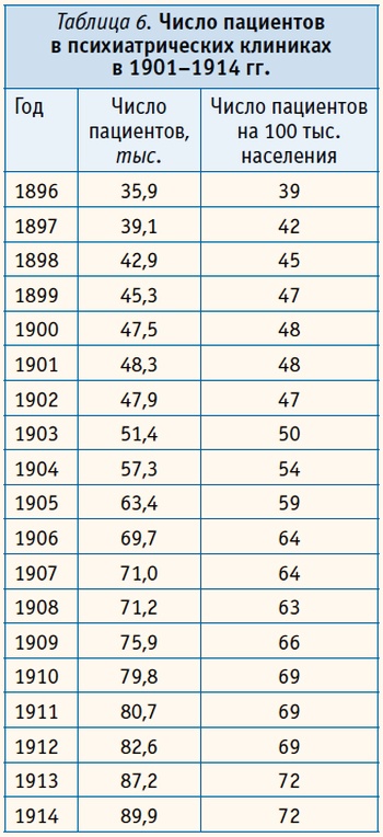 В 50 губерниях Европейской России с 1901 по 1914 год число пациентов в клиниках увеличилось с 48 до 72 на 100 тысяч, но по абсолютному значению оставалось незначительным. Даже если его увеличить в 2,6 раза, то число душевнобольных возрастало до 234 тысяч или 187 на 100 тысяч населения. Это было намного меньше, чем в любой европейской стране и в России в настоящее время.