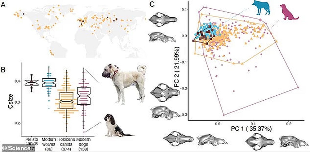 В общей сложности специалисты проанализировали строение и особенности 643 черепов собак и волков, живших на протяжении последних 50 тысяч лет. Древнейшие собачьи останки, отличные от волка, были найдены в России, на мезолитическом памятнике Веретье-1, который расположен в Архангельской области. Здесь нашли три черепа животных, которые жили приблизительно 11,2-10,7 тысячи лет назад. Палеогенетики установили, что это были останки именно одомашненных собак.
