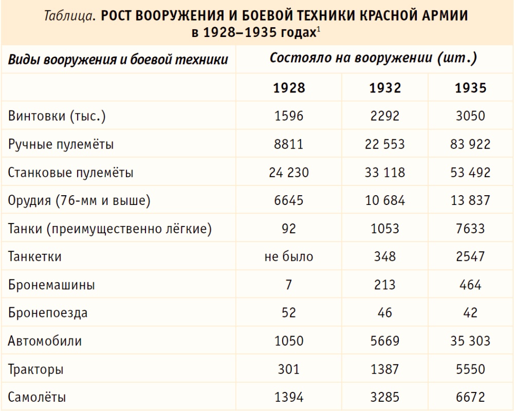 В первую очередь нужно было осуществить техническую реконструкцию Вооружённых сил. Первый пятилетний план строительства армии был принят в 1928 году. 1932-й стал переломным в танкостроении: было выпущено почти полторы тысячи танков и танкеток. За годы первой пятилетки производство самолётов возросло в 2,7 раза по сравнению с 1928 годом. Объёмы реконструкции показаны в таблице.