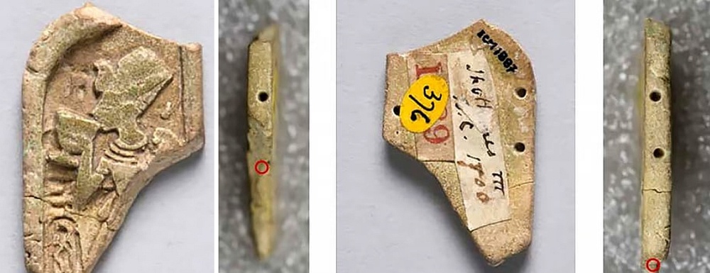 Сам фрагмент, обозначенный как ECM 1887, был найден не в гробнице Тутанхамона. Его приобрел на рынке древностей в конце XIX века выпускник Итонского колледжа и передал учебному заведению по завещанию. Это небольшая пластина из песка, кремня или дробленого кварца, покрытая глазурью, с отверстиями для крепления к воротнику.