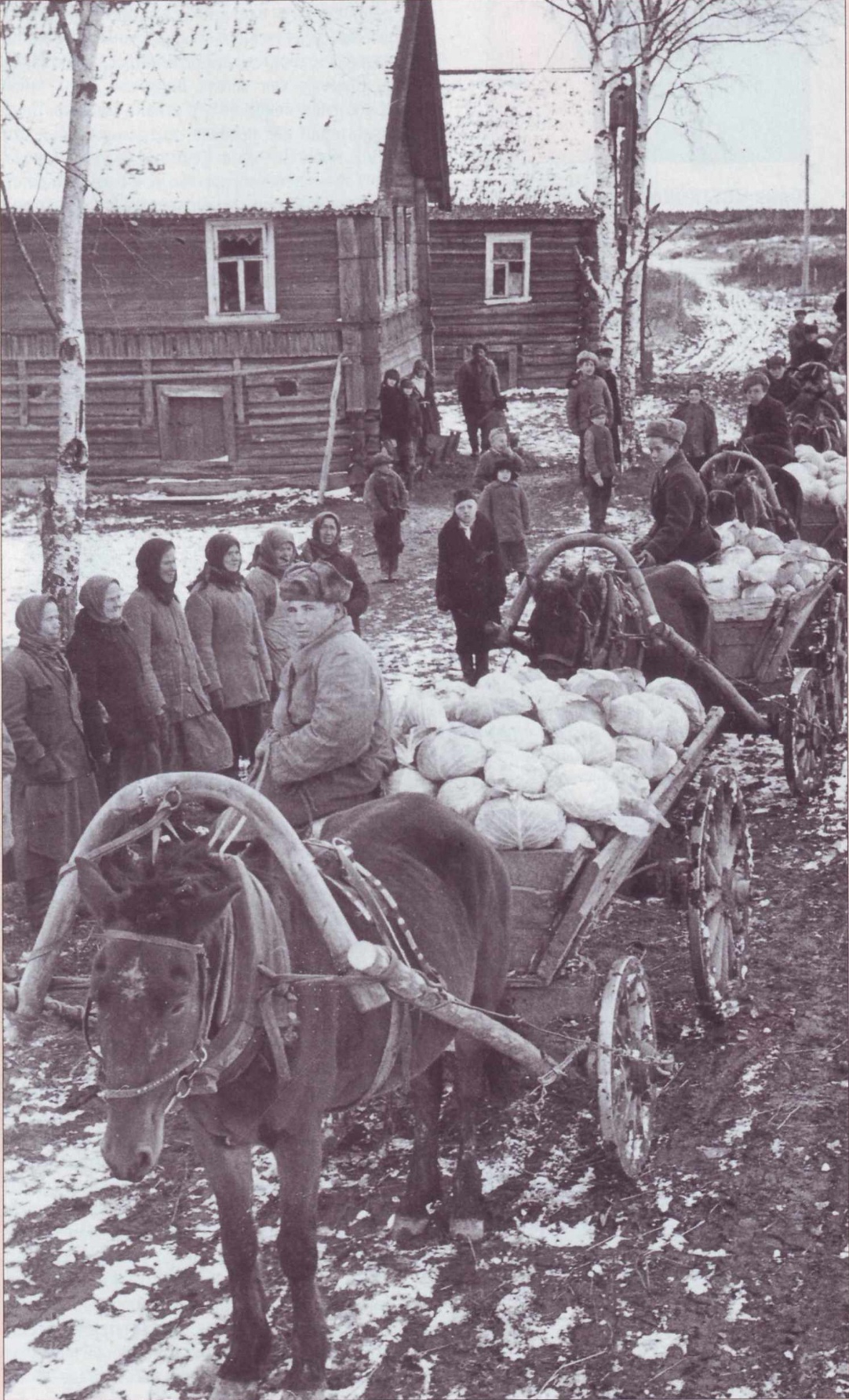 Стоявший в многочасовой очереди за хлебом крестьянин вызывал всеобщее недовольство горожан, и никто из них не задумывался над тем, почему хлебороб остался без хлеба и вынужден покупать его в городском коммерческом магазине. Дело в том, что все жители сельской местности не получали карточек на продовольствие и промтовары. Предполагалось, что все необходимые продукты колхозник получает за трудодни в колхозе или выращивает на своём приусадебном участке. Централизованное государственное снабжение было организовано таким образом, что в деревне нельзя было купить даже те специфические товары, которые никому, кроме крестьян, не были нужны. За жбанами, бочками, вёдрами, граблями, хомутами и дугами крестьяне были вынуждены ездить в город. Откуда же у них были деньги для этих покупок? От продажи на рынке картофеля и овощей, мяса и молока, яиц и масла. Цены на эти продукты были высокими: килограмм деревенского сала стоил на рынке 200 рублей - это были очень большие деньги. В июне 1946 года 230,9 тысячи москвичей (11,9 процента всех столичных рабочих и служащих) за эти деньги работали целый месяц. Именно с деревенским салом ассоциировались представления колхозников о вольной и сытой жизни. "Колхозники ни один не доволен колхозами, они говорят, что если бы не было колхоза, мы бы жили - деревни, села и города. Сало с салом ели б"1.