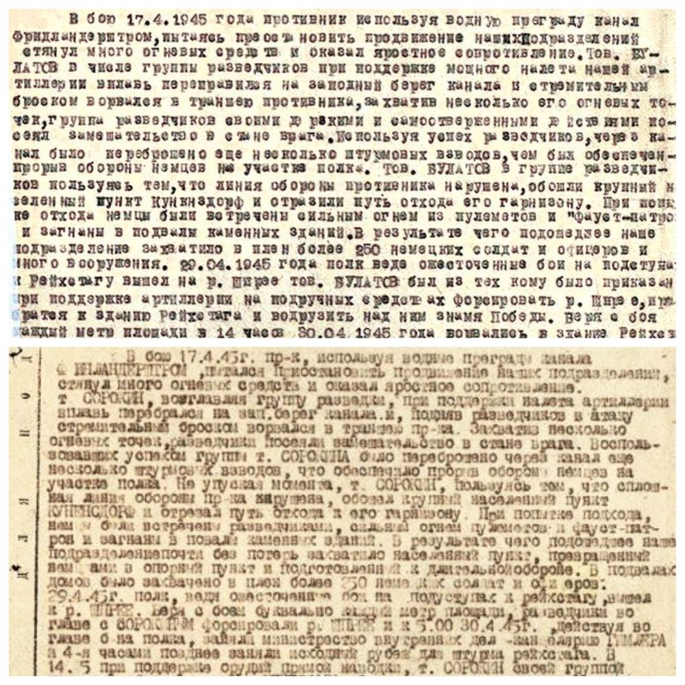 Красноармеец Булатов Григорий Петрович, 1925 года рождения, разведчик взвода пешей разведки 674-го стрелкового полка 150-й стрелковой дивизии. "Булатов был из тех, кому было приказано при поддержке артиллерии на подручных средствах форсировать реку Шпрее, пробраться к зданию Рейхстага и водрузить над ним знамя Победы. Беря с боя каждый метр площади, в 14 часов 30.04.1945 года [разведчики] ворвались в здание Рейхстага, с ходу захватили выход одного из подвалов, заперев там до 300 немецких солдат гарнизона Рейхстага. Пробившись на верхний этаж, тов. Булатов с группой разведчиков в 14 час. 25 мин. водрузил над Рейхстагом Красное знамя"5.