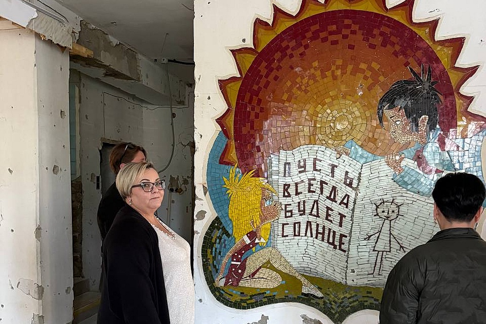 В главной библиотеке Анапы, где идет капремонт, обнаружили фрагмент советской мозаики. Он был скрыт под слоями штукатурки. На мозаичном панно изображены мальчик и девочка с раскрытой книгой, где написано "Пусть всегда будет солнце". Вокруг - явно морской пейзаж и огромное солнце.