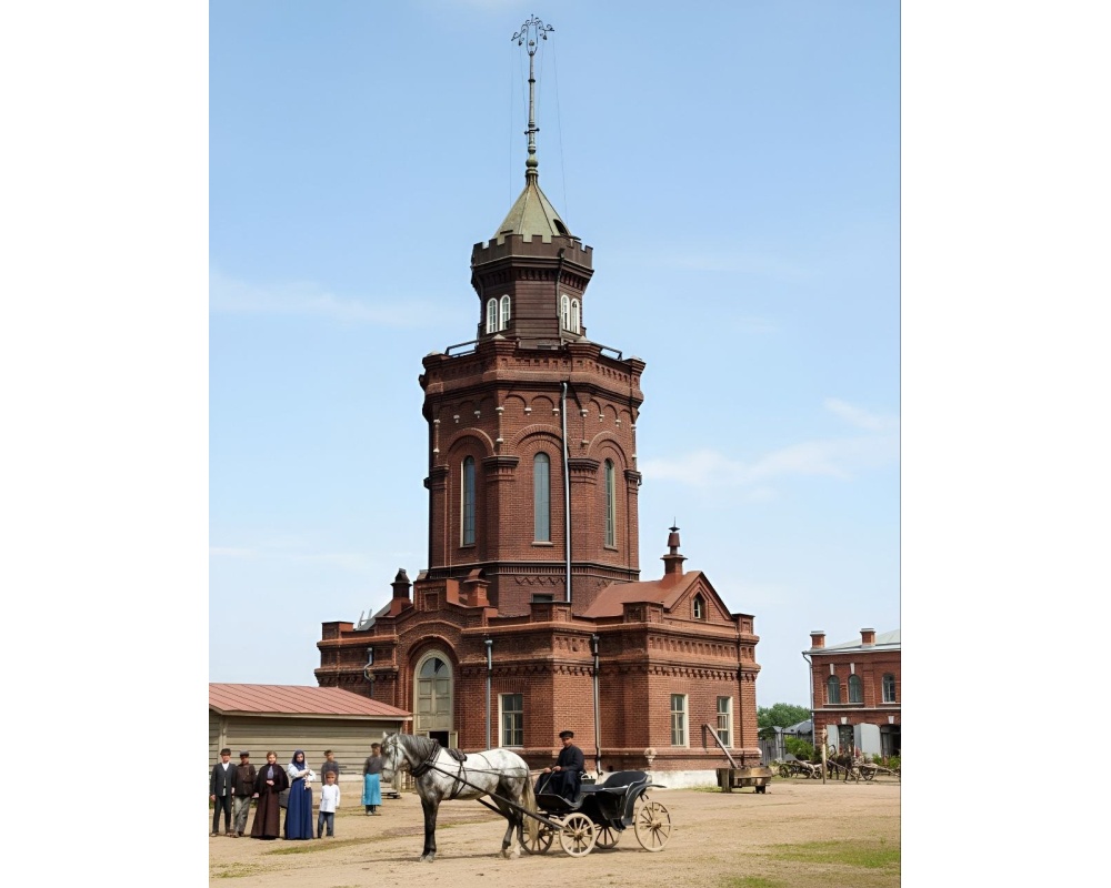 Изящное строение появилось в центре, у Базарной и Соборной площадей, в 1883 году. К слову, на средства горожан, а не казенные деньги. Городу требовался пожарный водопровод, такой проект был одним из первых в России, и шуяне охотно жертвовали на это важное дело. Водонапорная башня имела внутри металлический бак на восемь тысяч ведер. Снаружи находились водоразборные колонки в виде башенок поменьше и желоба-поилки для лошадей.