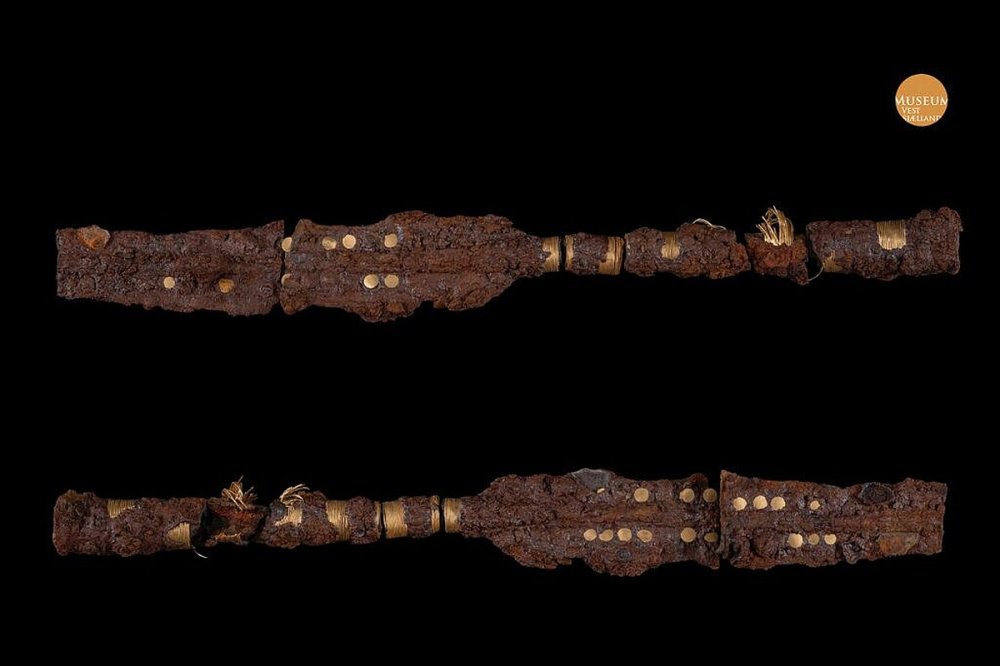 Найденные артефакты ученые посчитали неожиданными для этой местности - проржавевшие наконечники копья, покрытые золотом. Ранее не было никаких данных о том, что в бронзовом веке производили железное оружие, да еще и с изысканным украшением в виде герба.