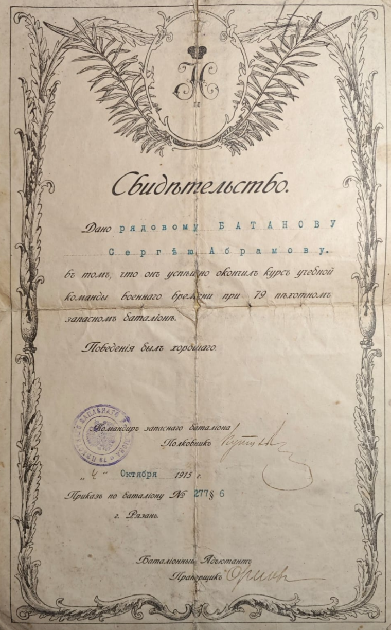 У меня хранится любительская фотография, которая сделана в селе Кишлееве Владимирского уезда 1 августа 1914 года. Именно в тот день Российская империя вступила в Первую мировую войну на стороне Антанты. На фотографии еще мирная жизнь - в саду варят варенье. Мой отец Александр Батанов (1910 - 2004) держит миску с пенками. Фотографировал агроном Кревин, которого наняла сельская община и определила на квартиру к Батановым. Полное имя не знаю, бабушка звала его Володей.