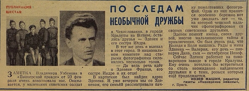 В газете появились еще заметки, которые рассказывали о поисках маленьких солдат, их чешских друзьях Зденеке и Индре, о боевых заслугах и пережитых опасностях. Состоялась встреча трех героев в Чехословакии по приглашению ЦК Чехословацкого союза молодежи и редакции "Пионерских новин".