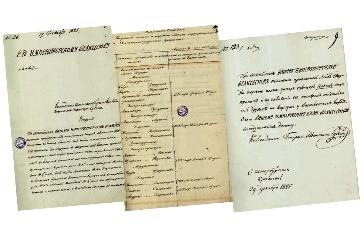 Слева направо: Рапорт коменданта Петропавловской крепости генерал-адъютанта А. Я. Сукина Николаю I о помещении в крепость арестованных солдат. 15 декабря 1825 г. ГАРФ; Список арестованных солдат, содержащихся в Петропавловской крепости. 29 апреля 1826 г. ГАРФ.; Рапорт А. Я. Сукина Николаю I о помещении в крепость арестованного унтер-офицера. 29 декабря 1825 г. ГАРФ.
