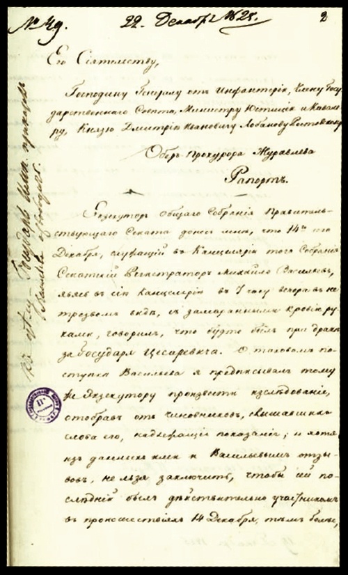 Среди тех, чья жизнь резко разделилась на до и после 14 декабря, находился и 22-летний чиновник канцелярии Общего собрания санкт-петербургского департамента Сената Михаил Иванович Васильев. Это был потомственный чиновник. О его происхождении в формулярном списке сказано кратко: "из канцелярского звания". На службу он поступил в возрасте 14 лет в 1817 году, в течение пяти лет занимался переписыванием бумаг и лишь в 1822-м дослужился до классного чина сенатского регистратора. Канцелярская служба в Правительствующем сенате сулила Васильеву если не успешную карьеру, то несомненное материальное благополучие. Однако этому не суждено было сбыться.