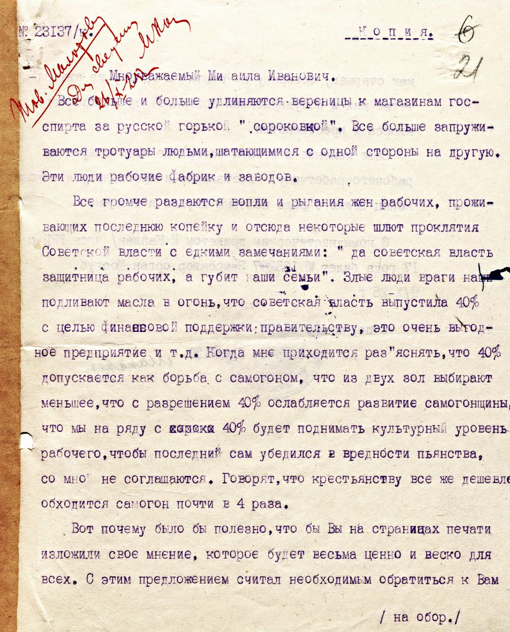 Заметили это и сознательные граждане, завалившие власть письмами и жалобами на последствия свободной продажи дешевой водки. Л. Сороконожкин-Босых в письме И.В. Сталину, полном сарказма и каламбуров, расценивал решение как противоречащее пути к коммунизму (док. 7). На замешательство, в котором пребывает партийная среда, указывал председатель Ульяновской контрольной комиссии РКП(б) И.Ф. Рыбочкин (док. 8). Член партии И. Каплан в письме М.И. Калинину просил его высказать авторитетное мнение в печати (док. 9).