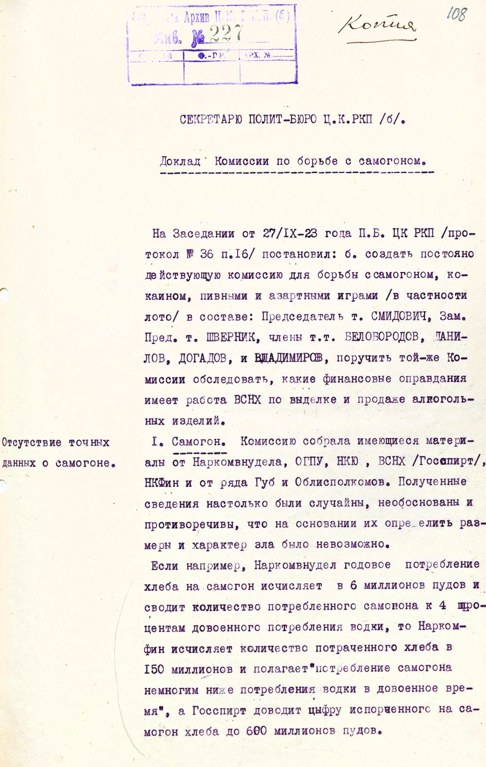 На заседании от 27/IX-23 года П[олит]Б[юро] ЦК РКП (протокол N 36 п. 16) постановил: б. Создать постоянно действующую комиссию для борьбы с самогоном, кокаином, пивными и азартными играми (в частности, лото)..., поручить той же комиссии обследовать, какие финансовые оправдания имеет работа ВСНХ по выделке и продаже алкогольных изделий...
