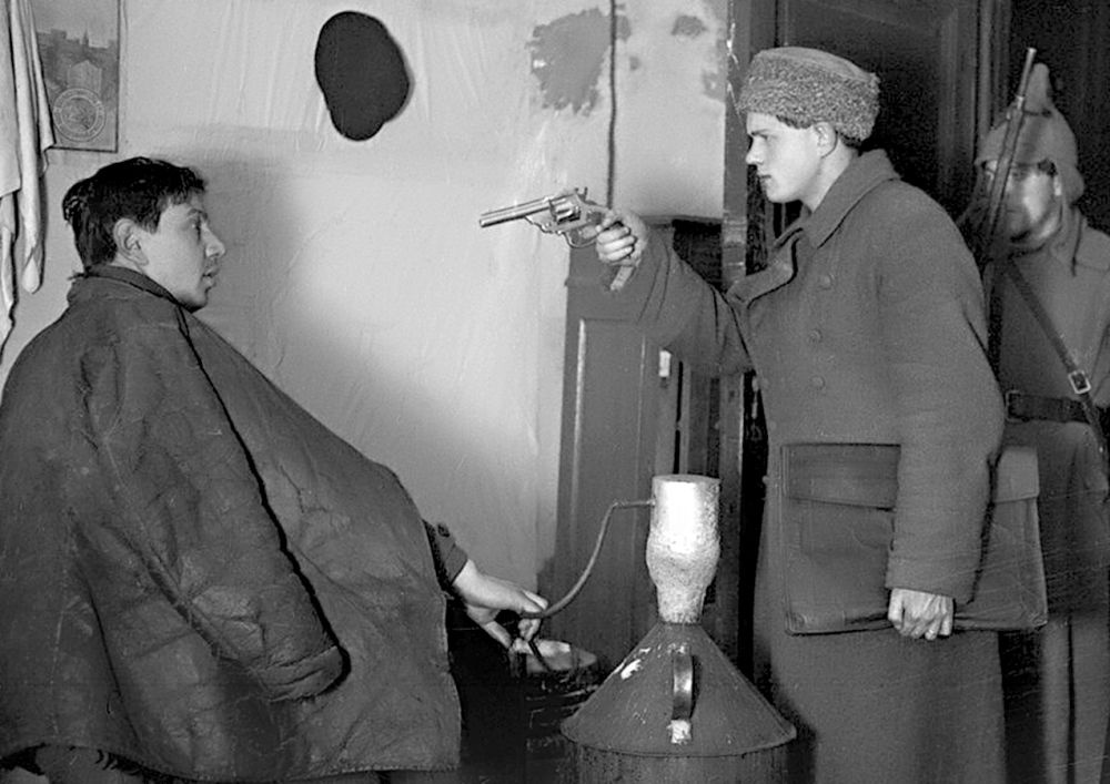 4. На Октябрьской улице постовой милиционер "организует упаковку" на ломовом извозчике, стягивая веревками, силами соседних дворников, шестерых "до ризположения" "преданных" последнему мероприятию Соввласти по оздоровлению условий жизни рабочего класса.